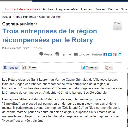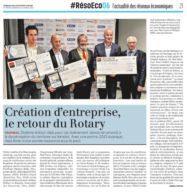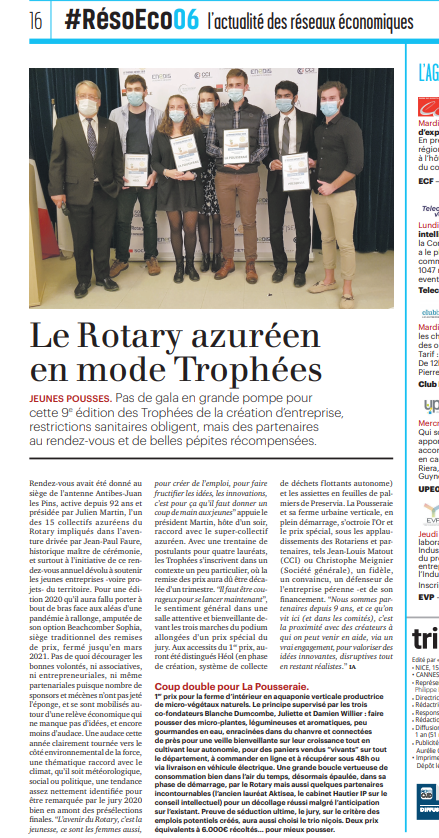 Le Trophée Rotary de la création d'entreprise est organisé par les Rotary clubs Antibes-Juan-les-Pins, Cagnes-Grimaldi, Cagnes-Renoir, Grasse, Mandelieu-Val de Siagne, Nice Riviera Côte d’Azur, St-Laurent-du-Var, Saint-Paul-de-Vence, Sophia-Antipolis, Villeneuve-Loubet-Baie-des-Anges et Villeneuve-Loubet-Côte d’Azur.